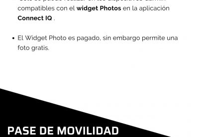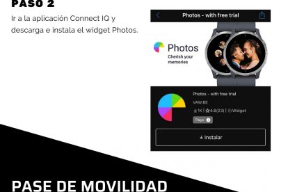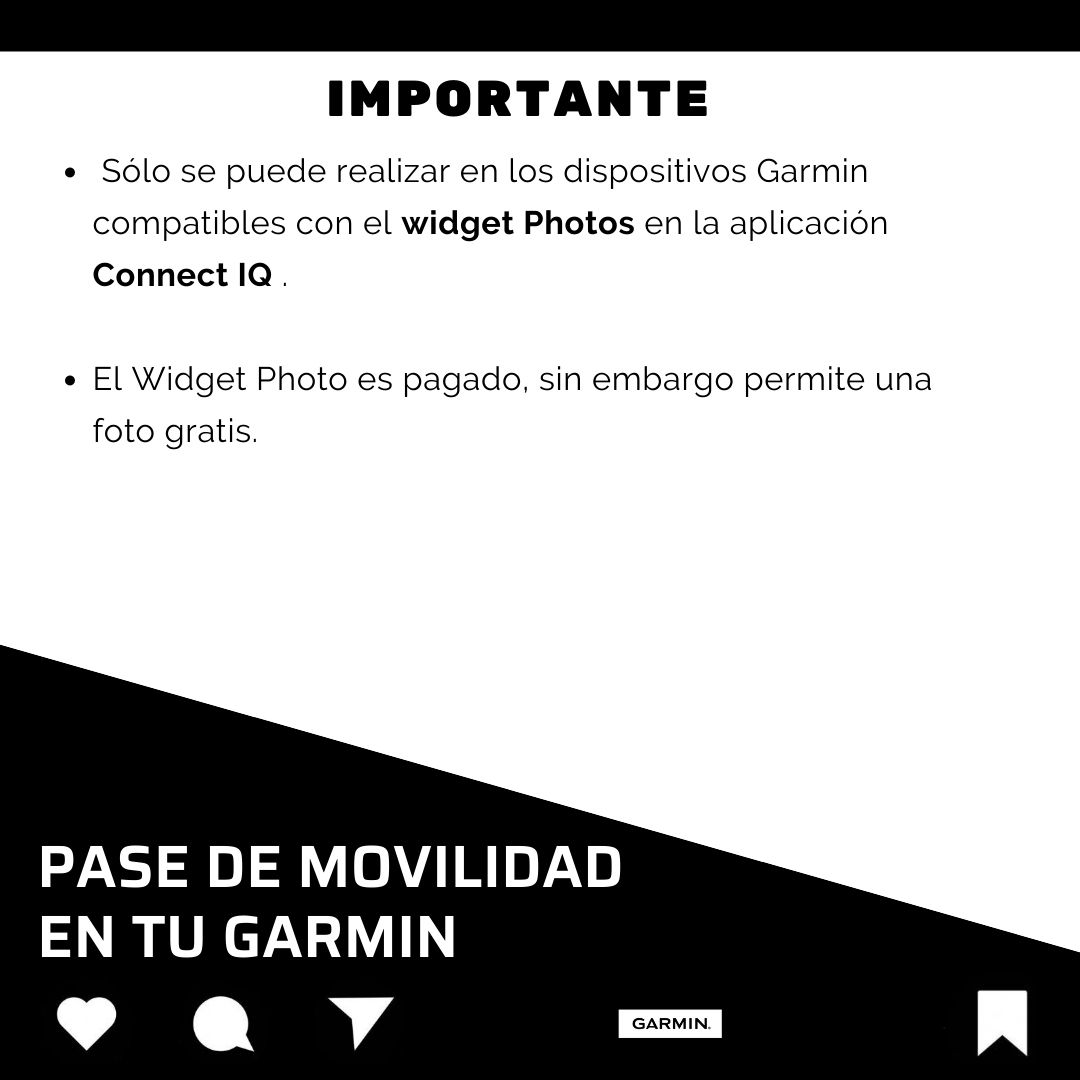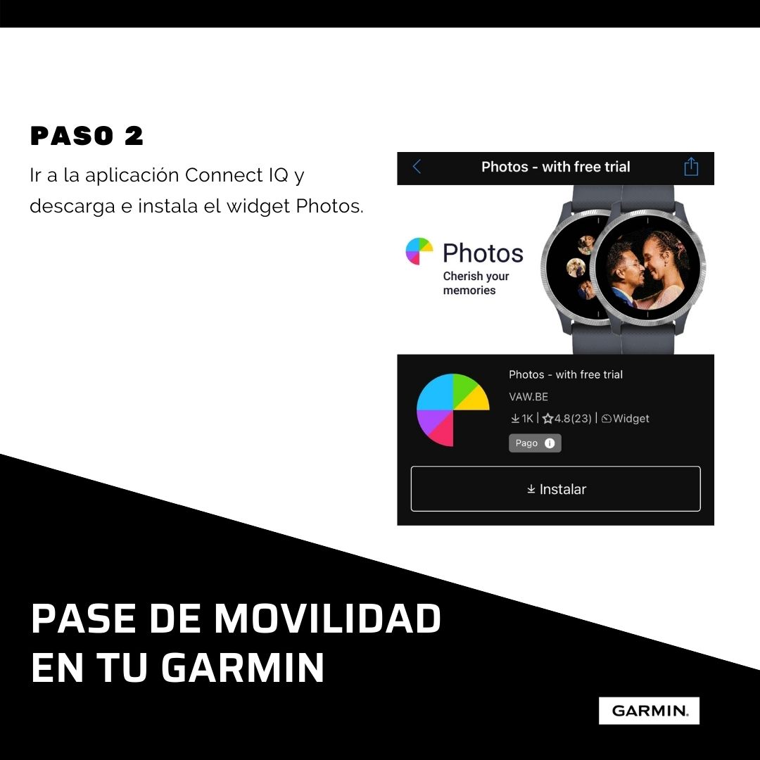 Es importante destacar que solo se puede realizar en los dispositivos Garmin compatibles con el widget Photos en la aplicación Connect IQ (https://apps.garmin.com/en-US/apps/cf8c58b1-54ae-4cb9-92de-c0e9a41789d6). El Widget Photo es pagado, sin embargo, permite una foto gratis. Entre los equipos están Vívoactive 4 y 4S; Vívoactive 3 Music; Venu SQ; Venu 2; Línea MARQ; Línea Fenix 6; Línea Fenix 5; Forerunner 245 Music; Forerunner 645 Music; Forerunner 945 Music y Descent.