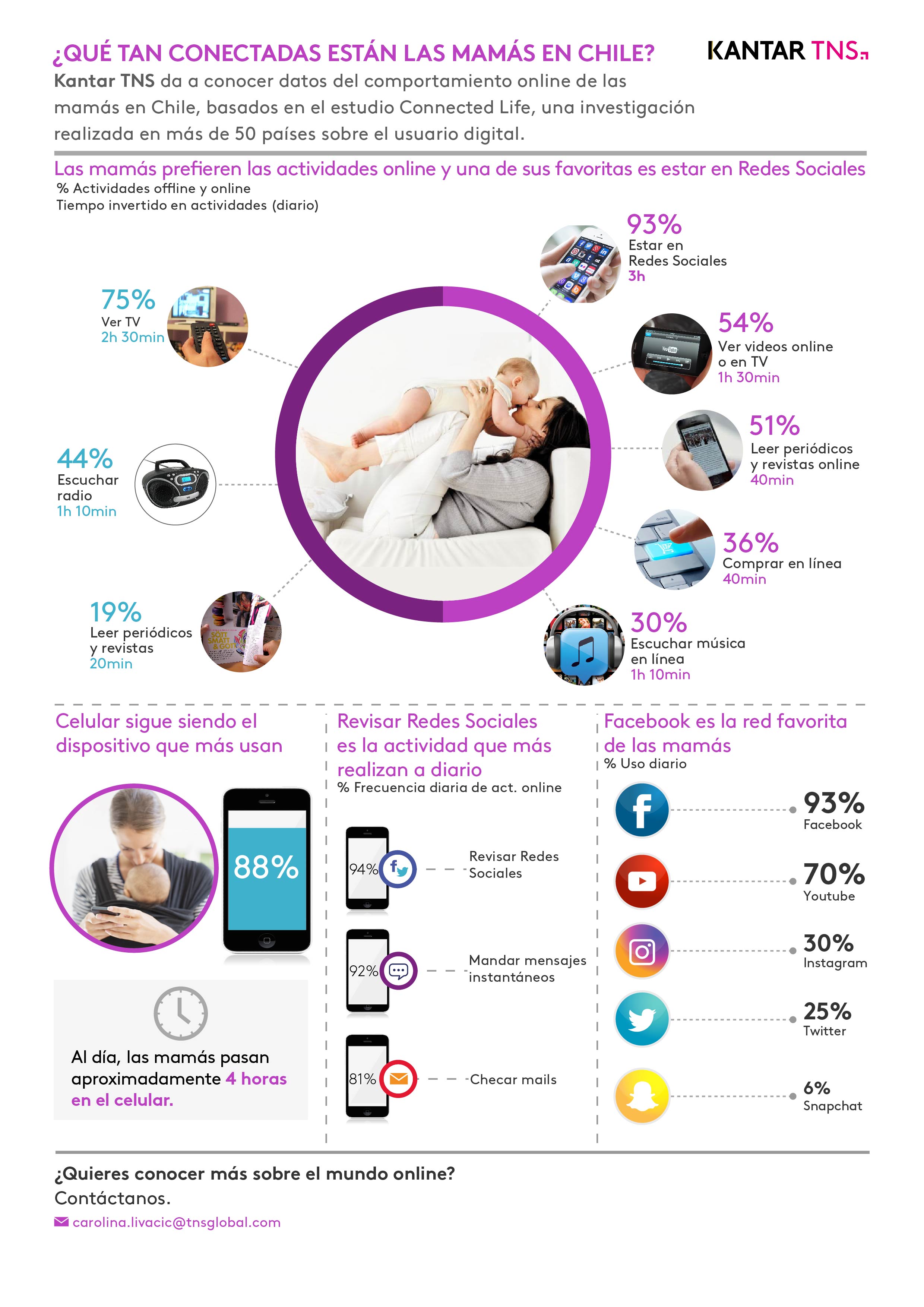 Un nuevo estudio de Connected Life, realizado por Kantar TNS, intenta descifrar qué tan conectadas están las madres en Chile a través de cifras de preferencia y tiempo que utilizan a la hora de conectarse o informarse.