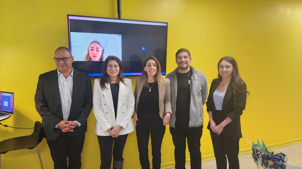 En la foto, de izquierda a derecha: Pablo Pisani, Gerente Comunidades Nitratos Yodo y Asuntos Públicos Norte SQM;  Varinka Farren, Directora Ejecutiva Hub APTA; Ximena Vial, Directora GSG NAB Chile; Javier Vega, Director Ejecutivo de Farmacia Fracción; y Pamela Cartes, Agente de Innovación Hub APTA y líder del desafío. En conexión remota: Andrea Samaniego – Coordinadora de investigación Impulsum – ESPAE.